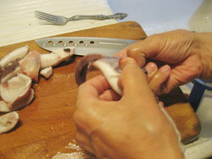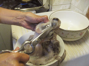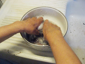 (3)塩でよくもみ洗いした後、水で塩を流す。