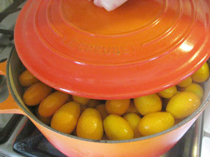 ![]() 若い頃、映画を観ているときに 外国人の女優さんが 今にも泣くその数秒間前、 目にいっぱい涙をためるシーンがありました。 涙が満ちあふれんばかりの湖のような目になり、 そのうるわしさに、うっとりとしたものです。 そして、次の瞬間、まばたきとともに、 大粒の涙が頬を伝わったときには、 その美しさにため息をついたものです。 私のように目が小さい者にとっては 涙がたまるスペースもなく、 河の水がとどまることなく流れるように さらさらと流れてしまいます。 けして、涙と感情の高まりを ためこむ面積は持ち合わせていません。 当時の私は、 少しでも目が大きく丸く見えるように、 目の運動や化粧に精を出したものです。 ところが、あるイタリア人の友人は、 私からみれば素晴らしく大きい目と、 まばたきをすると 空気の波ができるのではないかしらと思うほど、 長いまつげの持ち主ですが、 その彼女がなんと、切れ長の目に見えるように、 アイラインの入れ墨のようなものをしました。 つり目になるようなカーブです。 「あなたのような切れ長の目になりたいの! 寝起きでもお風呂上がりでも海でも、 いつもはっきりとした目でいたいの」 と言ってました。 そう、「アーモンドのような目」といわれる 東洋人の目に憧れる イタリア人女性は少なくありません。 私も彼女も まさしく「ないものねだり」ですね。 大きくて、かつ、切れ長の目‥‥ これが女性があこがれる 目のかたちの極みでしょうか? さて、今回ご紹介するレシピは私の大好物で、 イタリアに住んでいる日本人の友人が イタリア人のシニョーラから教わった 「ピリ辛キンカンジャム」です。 キンカンはこちらでは 「中国みかん」と呼ばれていて、 イタリアの南の地方では、 みかんやオレンジの木と 一緒に植えられているところを見かけます。 ちいさい実がたくさんなってかわいいので、 ミラノでは、鑑賞用として 鉢植えにして飾る人もいるほどです。 「ピリ辛キンカンジャム」は イタリアの南の地方のペペロンチーノと 東洋の味が融合した魅力ある味です。 今回は友だちが教えに来てくれました。 みなさんも私と一緒に習いましょう。