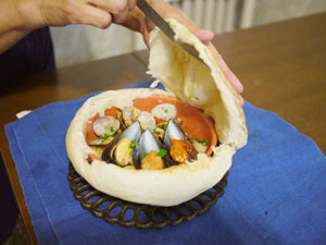 ![]() 夫の展覧会で北の街トレントに来ました。 この街特有のクリスマスの露店も 楽しみのひとつですが、 折しも「サンタルチーア」のお祭り中で、 街の中心地が露店で埋まっていました。 伝統的なこのお祭りは、 聖人が、夜、ロバに乗り、 1軒、1軒、子どものようすを見てまわり、 お利口さんにはプレゼントを 置いてくれるというもの。 子どもたちはロバのために、 窓の外にとうもろこしの粉でつくった ポレンタ粉と水を置くそうです。 クリスマスが浸透した現在でも、 このお祭りは続いていますので、 トレントの子どもたちは年末年始にかけて、 プレゼントを数回もらう機会があります。 「少しもらいすぎではないかしら?」と 友人のお父さんに聞くと 「フェスタで、プレゼントを何回もらっても、 子どもが喜ぶその顔を見て喜ぶのは親だから」 と言ってました。 伝統的な習わしが持つ、 愛情表現のひとつなのかもしれません。 「お利口さんにしないと サンタルチーアがプレゼントをくれないよ」 なんて言う楽しい会話が聞こえてきそうですね。 ![]() ▲「お利口さんにはキャラメルをあげるよ〜」 と言いながら、 子どもにキャラメルをあげているお嬢さん。 ![]() ▲クリスマスの露店です。 北国らしい手作りの民芸品や 土地の食べ物が並びます。 ![]() ▲冷えてきた身体には「ビィンブルレ」と呼ばれる スパイスやフルーツを効かせて甘くした あたたかいワインを。 周囲にはコーラスや音楽を演奏するグループいて、 クリスマスの雰囲気が高まります。 ![]() ▲昼間からお祭りに居座っている私は、 食べています。 大好物のポレンタとチーズの盛り合わせです。 右にいるのはミラノから来たマリアさん。 ![]() ▲またまた食べます。 今度は柔らかいポレンタと鹿のソース。 その土地の物を食べる美味しさは格別です。 身体も心もあたたまります。 ところで、我が街ミラノのクリスマスも ご紹介しましょう。 「ライトプロジェクト」のようすです。 ![]() ▲ナビリオ運河の水の内からのライトアップ。 テーマは「魚との共存」です。 ![]() ▲高級ファッションエリアの道は、 ナポリの小道を彷彿させる 「洗濯物干し」になりました。 ![]() ▲こちらも「洗濯物干し」です。 ライトの演出が伝えるメッセージ。 心躍るクリスマスの楽しさに拍車がかかります。 「明かり」が街に満るこの時期は 身体の中にも明かりが灯る感覚が伝わってきます。 さて、今回のメニューは 身体がほかほかに暖まる 「スパゲッティボンバ」です。 少し手間がかかりますが、 スパゲッティを2倍楽しめます。 時間のない方は ピッツァ生地を市販のものにして、 お作りになってくださいね。
