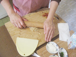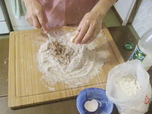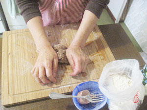 (4)残りのクルミは麺棒などで細かくつぶす。