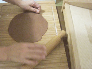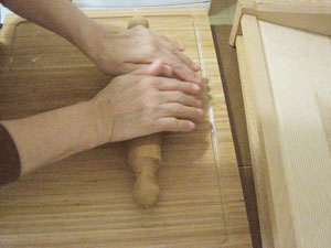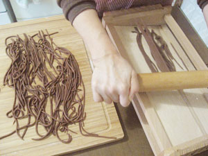 麺棒を何回か転がしながら、生地を切る。