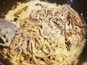 (10)ゆで上がったパスタをソースに入れる。