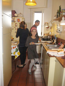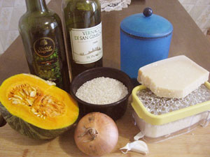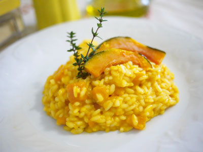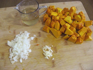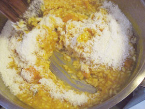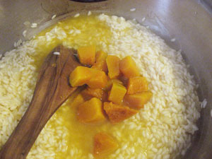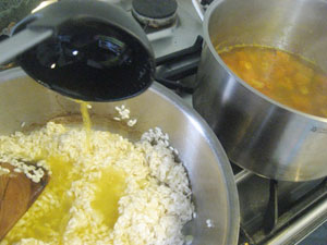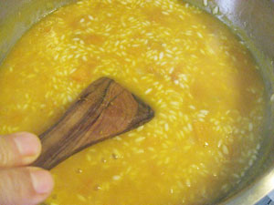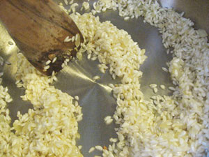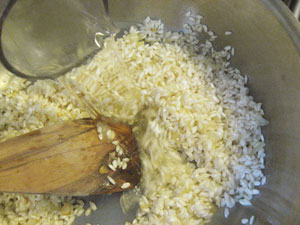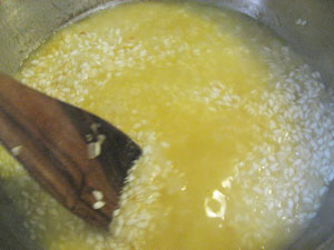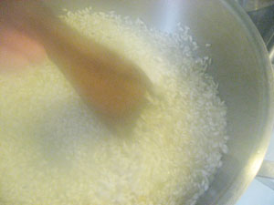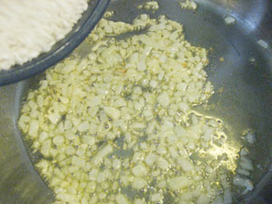 (3)タマネギがしんなりしてきたらお米を入れる。