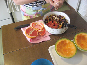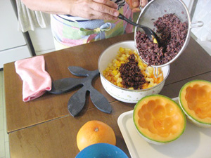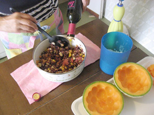 味付けし、メロンにつめて、飾り付けをする。