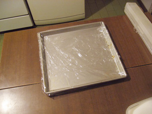鉄板にクッキングシートか、サランラップを敷く。