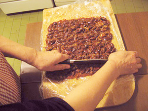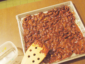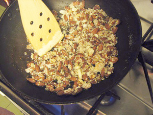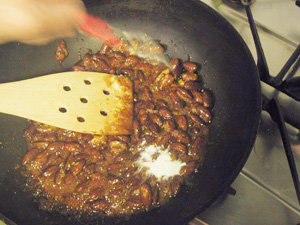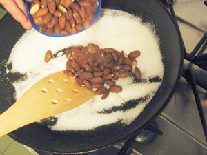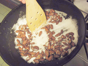 (3)少し溶けてきたらアーモンドを入れる。