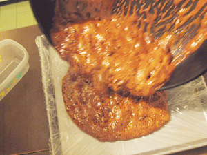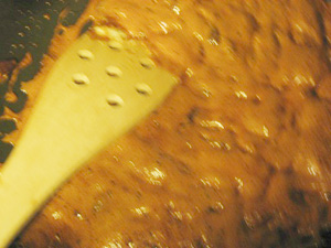 (6)キャラメル状になったら重曹を入れる。