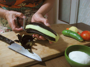 (1)ナスの皮を筋状に交互にはぐ。