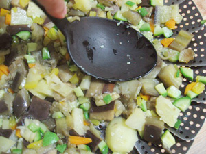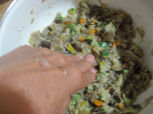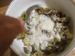 (15)混ぜながら指先でジャガイモとナス潰す。