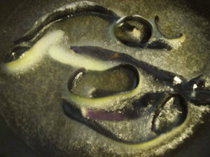 ナスの皮に小麦粉を薄くつけてさっと揚げる。