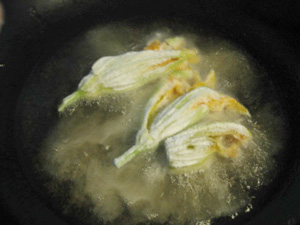 (13)ズッキーニの花も小麦粉をつけ揚げる。