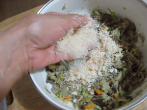 (16)パン粉を入れて混ぜる。