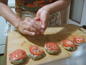 (19)トマトをのせ、よく押さえる。