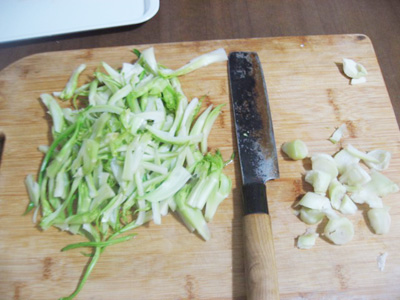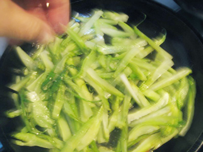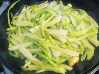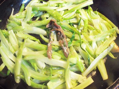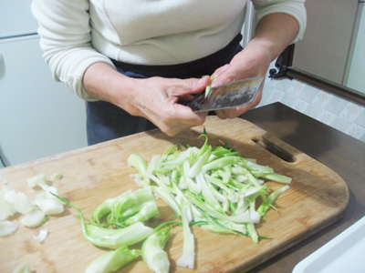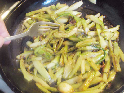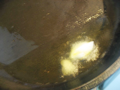 (2)オリーブオイルを入れたフライパンを傾けて、