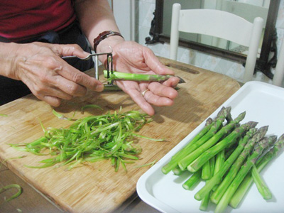 ・アスパラは下のかたい部分を除き、皮をはぐ。