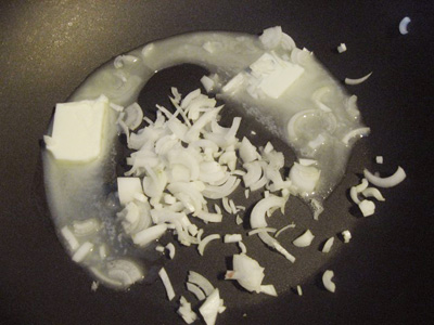 (1)フライパンにバターと