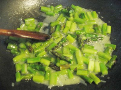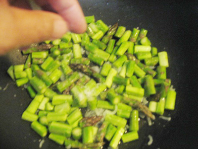 (2)アスパラと塩少々を加えて炒める。