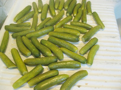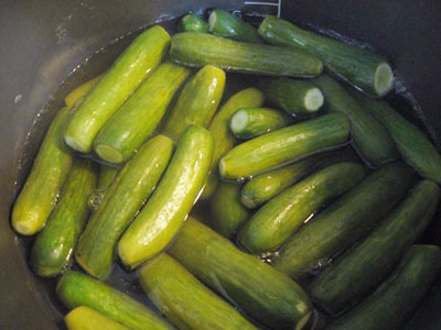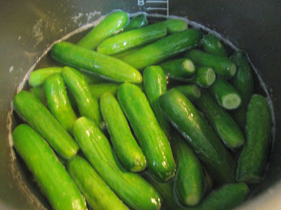 (6)キュウリを並べて、月桂樹の葉を入れ、