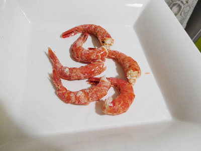 (4)蒸したエビをお皿に並べる。