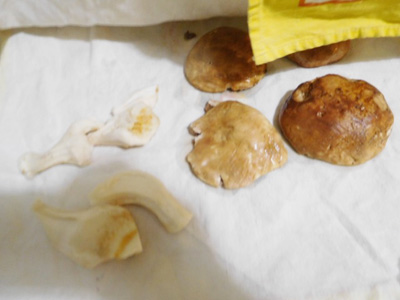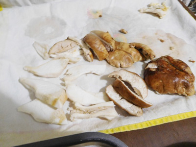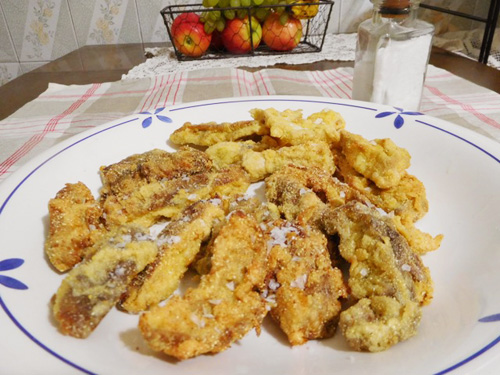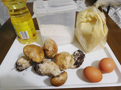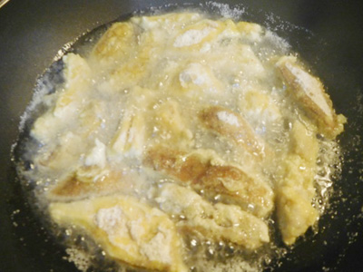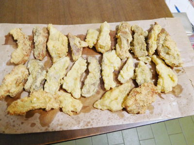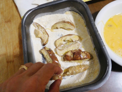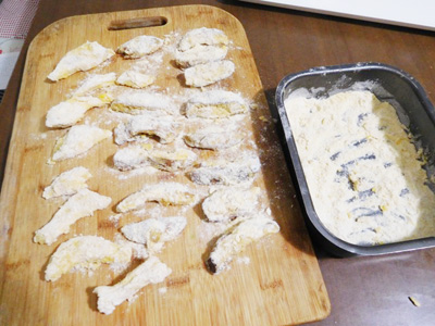 小麦粉とポレンタ粉を混ぜたものをつける。