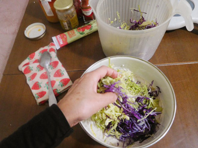 (5)洗ってよく水を切ったキャベツを入れる。