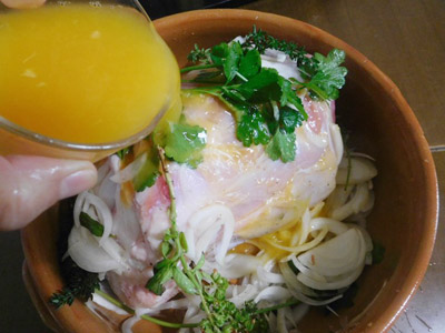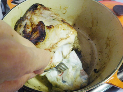 (1)肉を取り出して香草を取り除く。