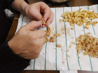 ![]() 買い物カートを引っ張りながら駆け足で、 我がアパートの入り口めがけて走り、 その人に近づきました。 その人は小包を抱えながら、 不在届けを書いていました。 不在届‥‥いくつもの体験を通して、 なるべく避けたい物になっています。 そして、 待ちに待っていた荷物がついに来た! という思いがつのって、 息を切らし、自分の名前を告げながら、 「その荷物は我が家あての物でしょうか?」 と急いでたずねました。すると、 「シニョーラ、 人と話す時はまず挨拶からではないかね?」 と言われました。 すぐに自分の無礼を詫びて、リプレイ。 「ボンジョルノ、その荷物は私あての物でしょうか?」 彼は無言で人の顔も見ず、 不在届を書き続けているので、 むっとした私は、 「人が挨拶したら、あなたも挨拶をしませんか?」 と火花を散らしてしまいました。 彼は不在届を入り口に貼り付けて、 返事もなしにそそくさと立ち去って行きました。 後味が悪い気持ちになりました。 彼のとった態度は、 挨拶をすることを教えてくれた人とは 思えないものでしたが、 それにもまして、 挨拶をしながら相手を突く一言を発した私は 「挨拶を交わす」ことを全く学んでいなかった、 と反省です。 人に教示するということは 言葉と態度で示さねばならない。 そして受ける方も 理解した態度と言葉で接しないといけない。 こんなことをやらかすときは、そうです、 お昼前でお腹が空いているときです。 「気をつけよ、災いを産むその一言」 いくらお腹が空いていたにせよ 心に余裕は持たなくてはいけませんね。 新年の初学びでした。 さて、今回はくるみソースのパスタをご紹介します。 冬の味を楽しみましょう。