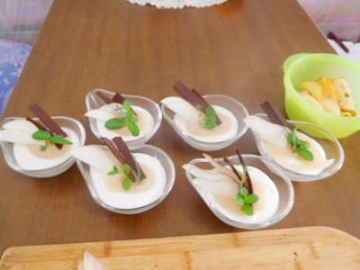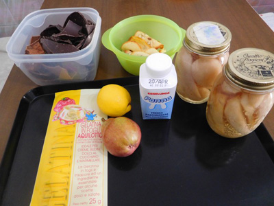 ![]() 昔と違って今はとても便利になって、 ミラノからローマに 電車で3時間で行けるようになりました。 朝8時出発の電車に乗り込むと、 ブリオッシュを出して朝食を食べている人や、 携帯電話で出発の挨拶をしている人がいて、 にぎやかでした。 そのうち私の席の前のほうから とりわけにぎやかなグループの声が 響き渡り始めました。 ちょっとのぞいて見ると、 8人の若い男の子たちです。 コットンの半袖Tシャツから ムキッとあらわれている筋肉隆々の両腕。 なにかスポーツをしている人たちだと 一目瞭然です。 試合の話が始まり、 声がまた一段と熱気を帯びてきたとき、 レフリーが入りました。 初老の婦人が彼らに近づき、 まるで息子に諭すように 「ラガッチィ、ここは電車の中ですよ。 もう少し声をおさえなさい。」 すると、そばにいた別の婦人が 「私も同感よ」と毅然と彼らに言いました。 ふたりのマンマから注意を受けた 豪傑で奔放な若者たちは、 一瞬にして声のボリュームを 数段階下げて話し始めました。 さすが、マンマの一声。効果絶大でした。 それでもローマに着くまでの3時間、 途切れず熱心に話していました。 話がつきない彼らに驚く私でした。 さて、ご紹介するのは梨のムース。 前回のラングドシャクッキーを添えます。 ムースは、梨のシロップ煮や梨の缶詰で作ります。 パスクワのチョコレートがまだあったので 付け合せの飾りも作りました。 付け合せはお好みでしてください。