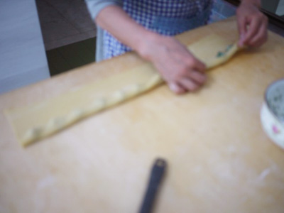 (3)生地と一緒に手前に転がす。