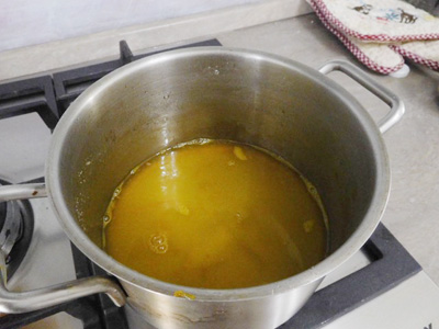 オレンジの絞り汁と水を加えて5分煮詰めて