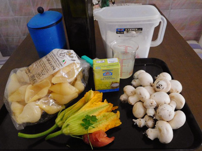 ・ズッキーニの花は三等分に切る。茎は筋をとる。