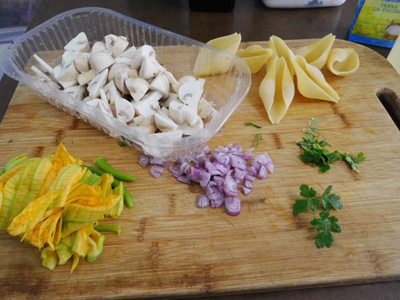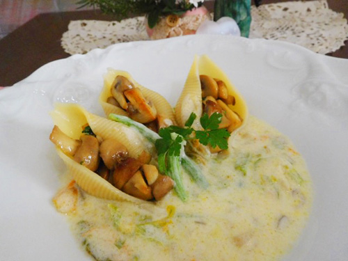 貝型パスタのキノコ詰め