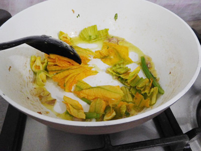 (7)ズッキーニの花と茎を入れ、