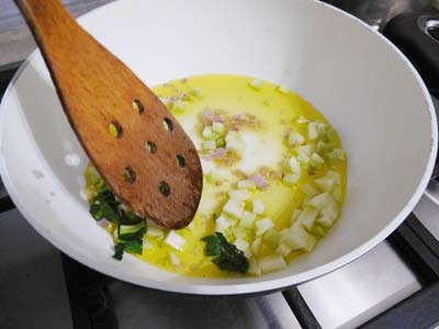 (5)フライパンにEVオリーブオイルを入れて