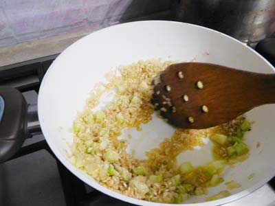 (2)(1)にお米を入れて数分炒める。