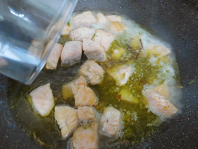(8)ゆっくりとサーモンを煮る感じで
