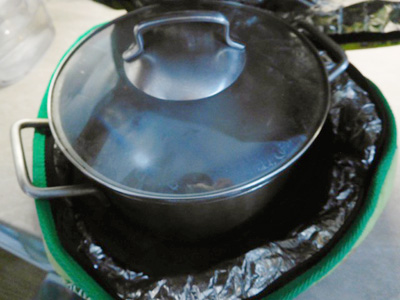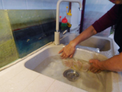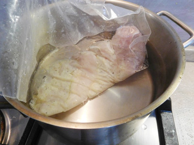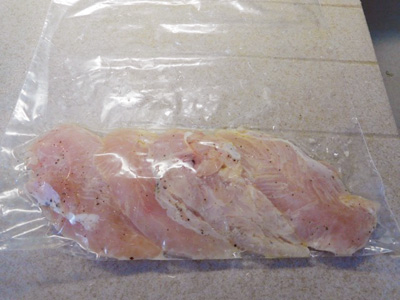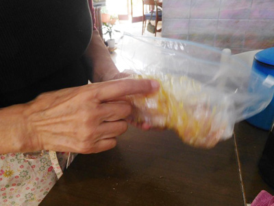 袋に入れたまま鶏肉を半分に割って様子を見る。