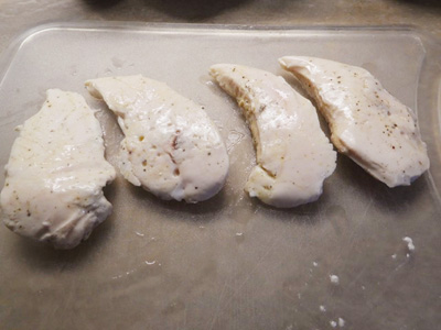 (1)鶏肉にフォークで数ヵ所、穴を開ける。