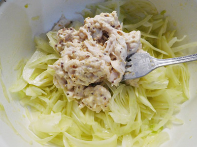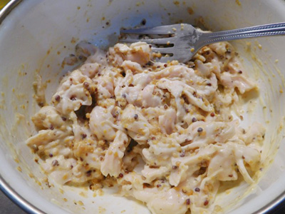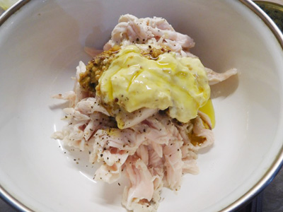 (13)鶏肉をほぐして、粒マスタード、マヨネーズ、