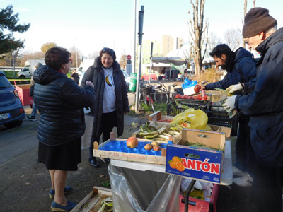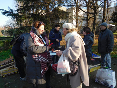 ![]() 毎週土曜日に近所で青空市場が開かれます。 日用雑貨、洋服、下着、園芸品、 野菜や肉、魚、チーズなど新鮮な物が買えて、 いろいろな用事がいっぺんにすみますので、 欠かさずに行きます。 ![]() △季節の物が並ぶ店先。 ![]() △青空市場の最終地点にかかげられたポスター。 ポスターを見ていると声がかかりました。 「お野菜、果物はどうですか? ご自由にお持ち帰りください」 簡素なテーブルの上に、 青空市場に参加している店から寄付された 野菜や果物が置かれていています。 売れ残ったものを店主が捨てる前に ボランティアがまわって集めたもので、 希望者に無料で配給されています。 ![]() △ボランティアたちは、 青空市場の終了時間前に 運搬車でまわって、 生鮮食料品の寄付を募ります。 ![]() △集められた物は選別されてきれいに掃除もされます。 私たちのボランティアグループの アントニア(左)は私たちの活動に 使える野菜をもらっていました。 ![]() △市場に来た御婦人と話す ボランティアのロゼッラさん(左)。 「会話をしながら気持ちを交わす」 これも活動の大切な目的のひとつ。 ![]() △このボランティア活動は、 ミラノの4つの青空市場で行われています。 地区の教会のボランティアのメンバーと 3つのグループが支えています。 売り物としての価値はないけど、 まだまだ使える物や、 捨てられてしまう物をまた活かす。 この循環を支えるボアンティア活動です。 「もったいない精神」は物を、 そして、人も救うのでは、と改めて思います。 活動をする彼らの姿を見て、 彼らの気持を疎かにしてはいけないと、 自分の日常の緩みを思い出し、 心の中に刻み込みました。 さて、そろそろバレンタインデーですね。 今年はこんなリゾットをふたりでいかがですか? ザクロのリゾットです。