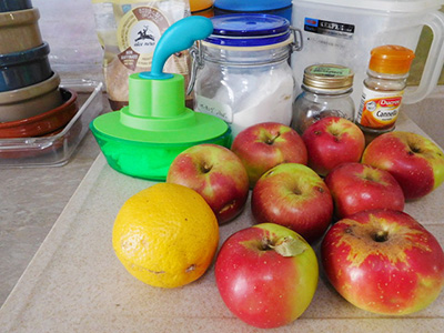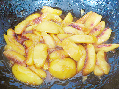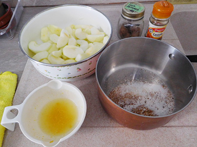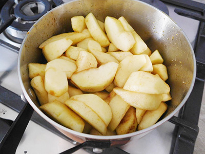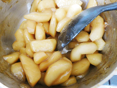 ・鍋にリンゴを入れて鍋ごと返しながら、