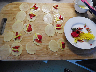 ![]() 明けましておめでとうございます。 今年もご愛読のほど宜しくお願い致します。 自宅にいる時間が長くなってきたころから、 毎週金曜日の夜にネットで映画を観ることにして、 週にけじめをつけるようになりました。 それが今、生活のリズムにもなってきました。 そうです「自宅で花金(はなきん)」導入です。 就寝時間が早い私は この日だけは夕食をしながらの鑑賞になります。 パジャマに着替えて、 美味しいものを食べながら映画を鑑賞する。 こんなときの料理は、簡単に食べられて、 片づけが少ないもの‥‥というわけで、 まずパニーノに始まり、今は肉まんです。 毎週金曜日に、 何十年かぶりに肉まんを作っています。 昔は、日本人学校のバザーや 子どもたちのお弁当によく作りました。 肉まんを蒸す香りに 家族ストーリーが重なって心踊ります。 豚まんの他に、最近は野菜まんや 教えてもらったカレー味などを作ります。 大きさもこぼさず食べられる 最適の大きさ探しを試みています。 飲み物はワインですが、それもなかなか合います。 サイドテーブルに全てを用意して、 ネット映画観賞会を始めます。 「ダダッダーン!」 このファンファーレの音を聞くと気分は高揚し、 異世界への突入が始まります。 肉まんを頬張りながら観て、 途中休憩を入れて簡単な片付けをして、 続きをフルーツ、木の実など食べながら観る。 終了ベルがなると簡単な片付けをして、 すぐにそのままの寝床に潜ります。 毎週金曜日「自宅で花金」を迎えられる。 それだけでも、大きな喜びなのです。 さて、今日のメニューはハイビスカスのリゾットです。 亜麻仁の種も添えます。 この一年もご一緒に 美味しい物を食べられるように過ごしましょうね。
