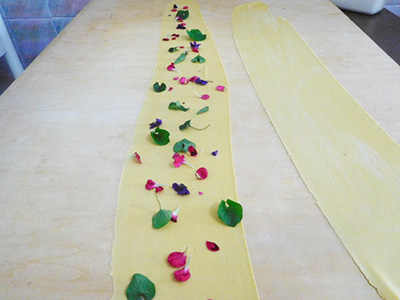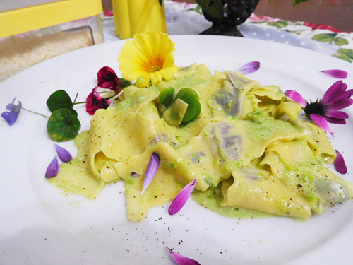 ![]() また今回も色の話にお付き合い下さい。 私はブルーが好きです。 海育ちだということも関係しているのでしょうか。 とはいえども、このブルー色、 苦い思い出もあります。 イタリアとフランスの 国境税関検問がなくなってすぐの頃、 車でフランスのリヨンに行ったときのことです。 今までとは違い、 スルーで国境を超えフランスに入れるので なんと便利! と思っていたところ、 高速道路を走っていたのに、 一般道路に入ってしまった錯覚に囚われました。 標識の色が急に変わったからです。 イタリアの高速道路の標識の色は、 緑地に白文字。 そして一般道路は青地に白文字です。 フランスは逆で、高速道路が青地に白文字で、 一般道路が緑地に白文字です。 全く知りませんでした。 道がふたまたになったところで間違えて、 一般道路に降りてしまいました。 その旅中、色から来る緊張感は、 なかなか取り除けませんでした。 隣国のオーストリアに行ったときも同じ感覚でした。 とはいえ隣国のスイスはイタリアと同じ色ですので、 安心して走ることが出来ます。 さて、ブルーでも特に好きなのは 少し茄子ががった色です。 そして、この色であふれているのがドイツの空港です。 私が日本に行くときの経由空港は、 ドイツに決めています。 経路指示の掲示板がその色で、 その上、はっきりとした 大きめの文字が書かれているからです。 吸い込まれるように次の搭乗口に行けます。 今まで、他の空港での乗り換えで いくつものストーリーを作ってきた 方向音痴の私でも、 この空港では確実に安心して移動できます。 これは、色だけではなく、 広さ、人の数、音響など それらの環境との関連性はあるとしても 一人旅でも安心感を得られるのは 私にとってはここなのです。 物を伝えたり、言ったりするとき、 「はっきり、すっきり、しっかりが一番」 と思う私ですが、 冷たい印象を受けるところが、 このブルーを加味することで、 色から湧き出るさわやかさで満たされて、 優しさの想いに包まれるのです。 さて、今回のメニューは、 前回に引き続き、春のお花シリーズです。 いろいろな色を愛でる、 この時期ならではのメニューです。 どうぞお楽しみ下さいませ。