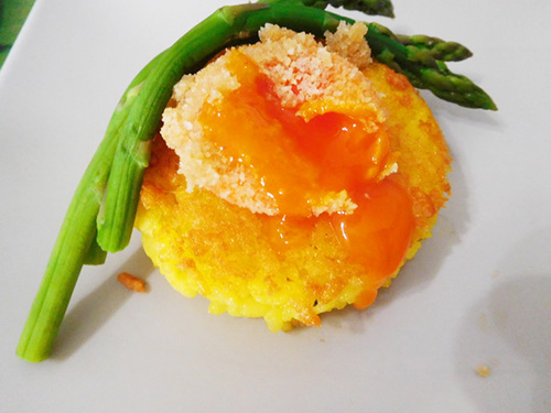 焼きリゾットの上に揚げ黄身をのせて