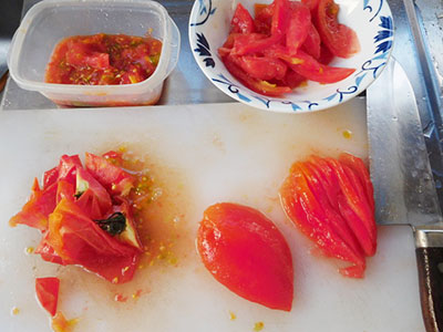 (2)湯煎したトマトの水分を少し絞り、