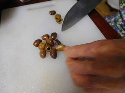 (7)オリーブは輪切りにする。
