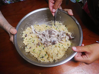 (12)ほぐした鯖を入れて、かき混ぜる。