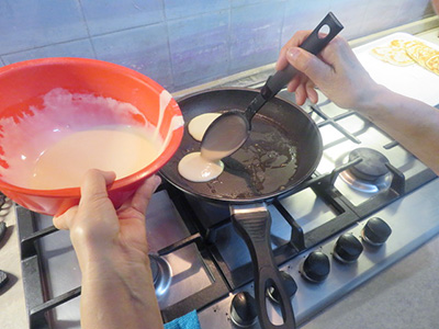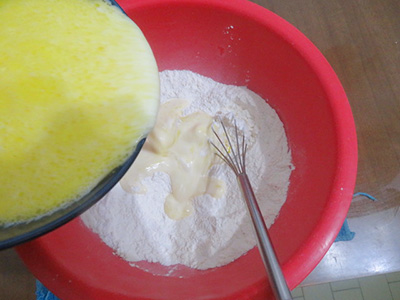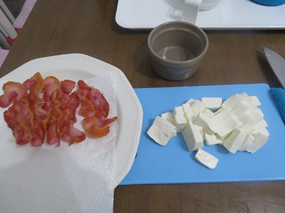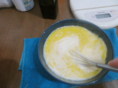 (1)卵、ミルク、EVOオイルを混ぜる。