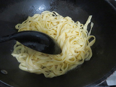(7)(5)のフライパンにパスタを入れる。