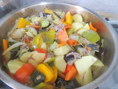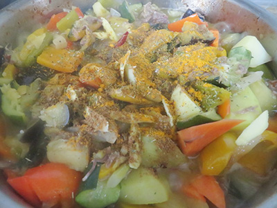 (11)オリーブとバジリコを入れてかき混ぜ、